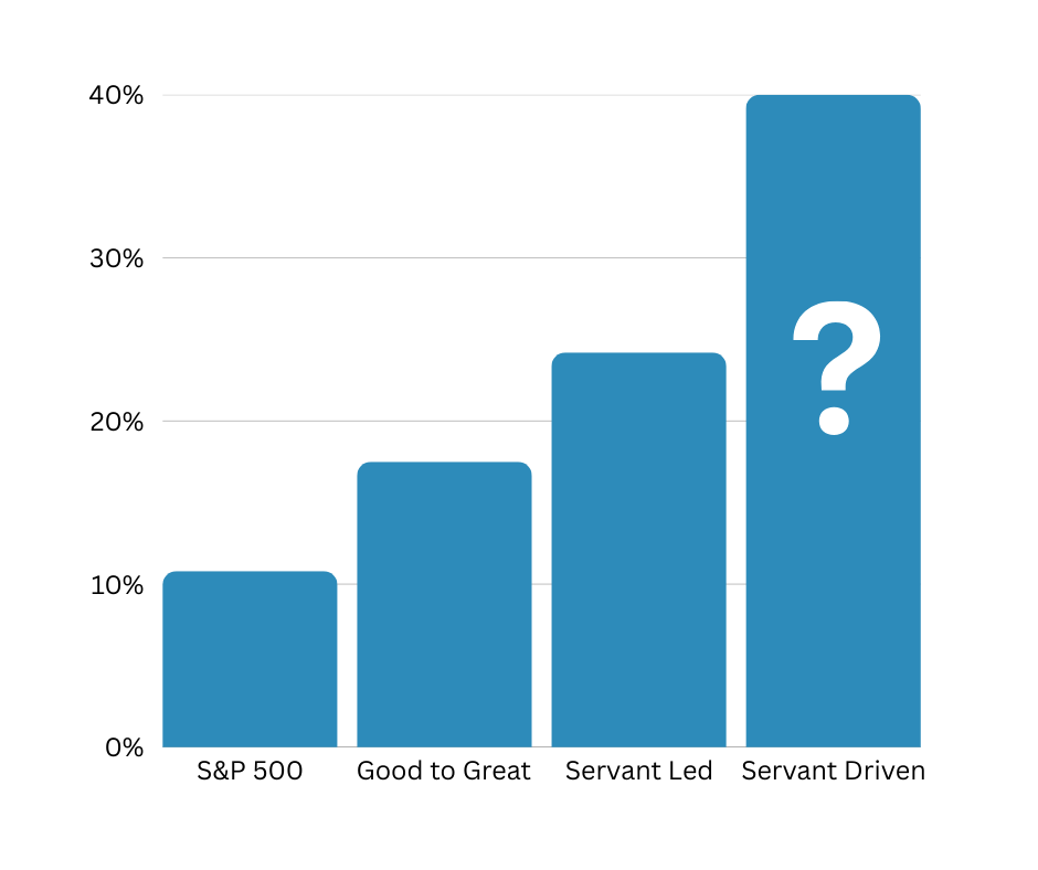 In the study, the S&P produced a 10.8% return. Companies profiled in Jim Collins Good to Great book delivered 17.5% returns. And finally, according to the research, Servant Led organizations turned out a shocking 24.2% return.